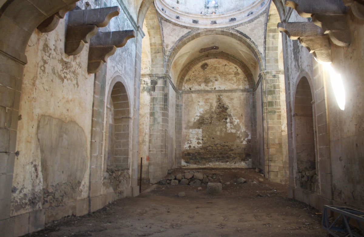 Todos los arcos son de medio punto y están realizados con grandes sillares de granito y son el esqueleto que sujeta toda la techumbre. El coro recrea otra bóveda prácticamente plana. Debió tener hasta órganos, a juzgar por los soportes que hay incrustados en la pared.